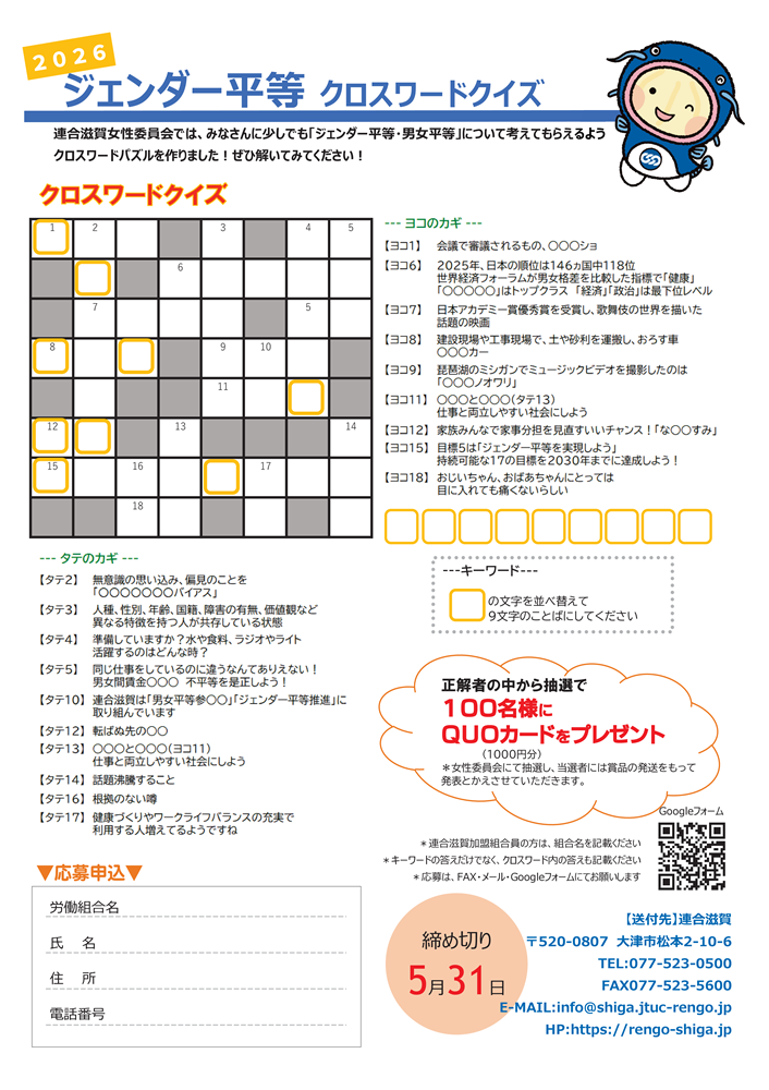 連合滋賀女性委員会にて作成したクロスワードを配布いたします!WEBでの応募可能ですのでぜひ皆さま挑戦してください!