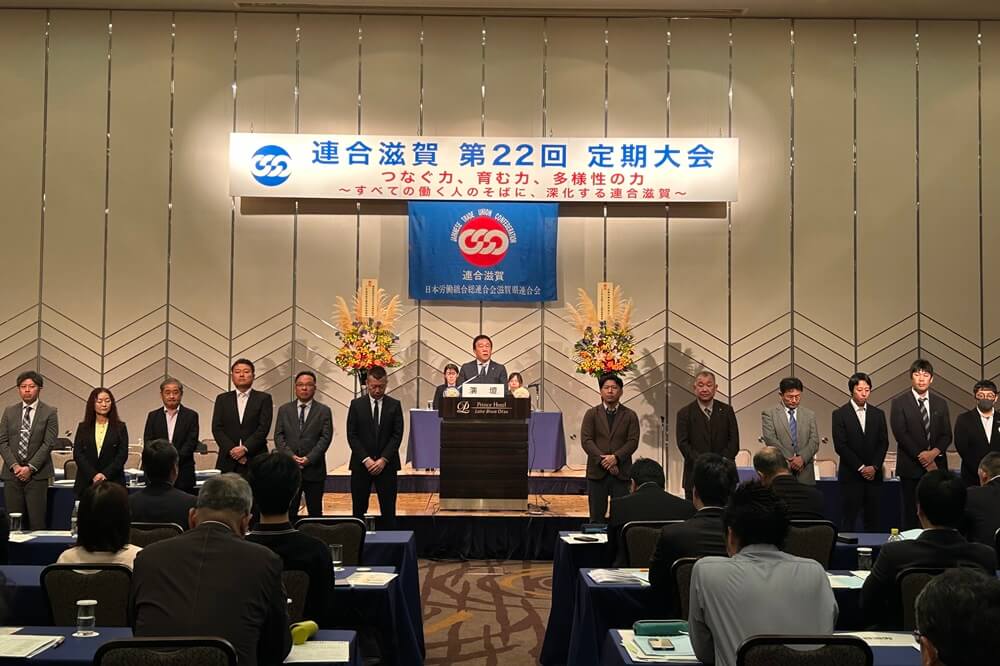 連合滋賀は2025年11月7日(金)にびわ湖大津プリンスホテルにおいて、「つなぐ力、育む力、多様性の力 ~すべての働く人のそばに、深化する連合滋賀~」をスローガンとした連合滋賀第22回定期大会を開催し、構成組織代表の代議員、特別代議員、傍聴者および連合滋賀役員等188名が参加しました。