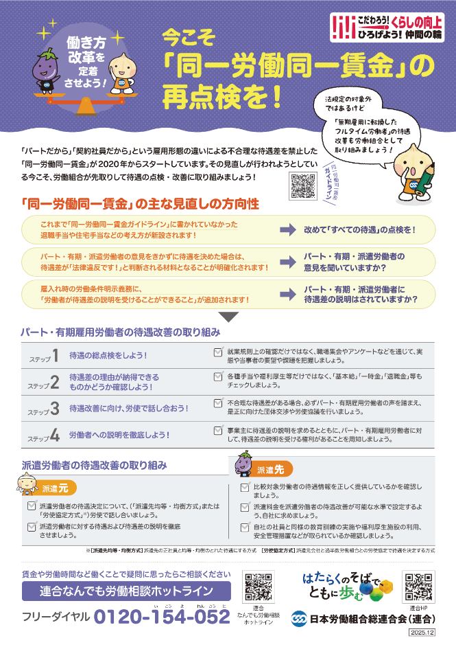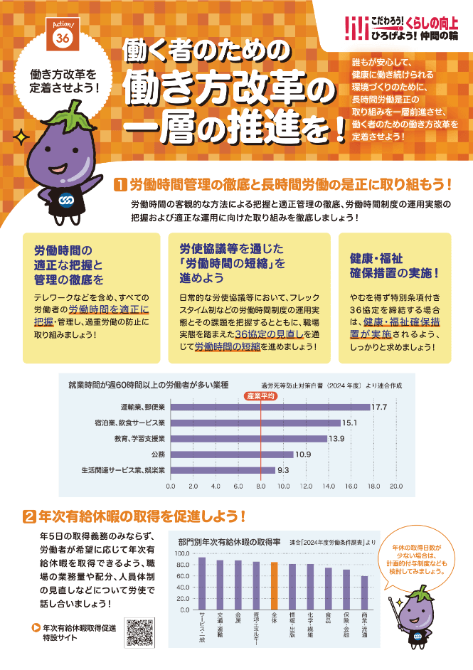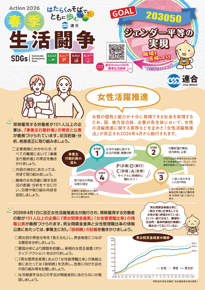 春季生活闘争では、働く者を取り巻く様々な問題を、雇用・労働問題だけではなく社会問題として捉え、「底上げ」「底支え」「格差是正」を柱に掲げて、すべての働く者のための取り組みを連合は進めています。
